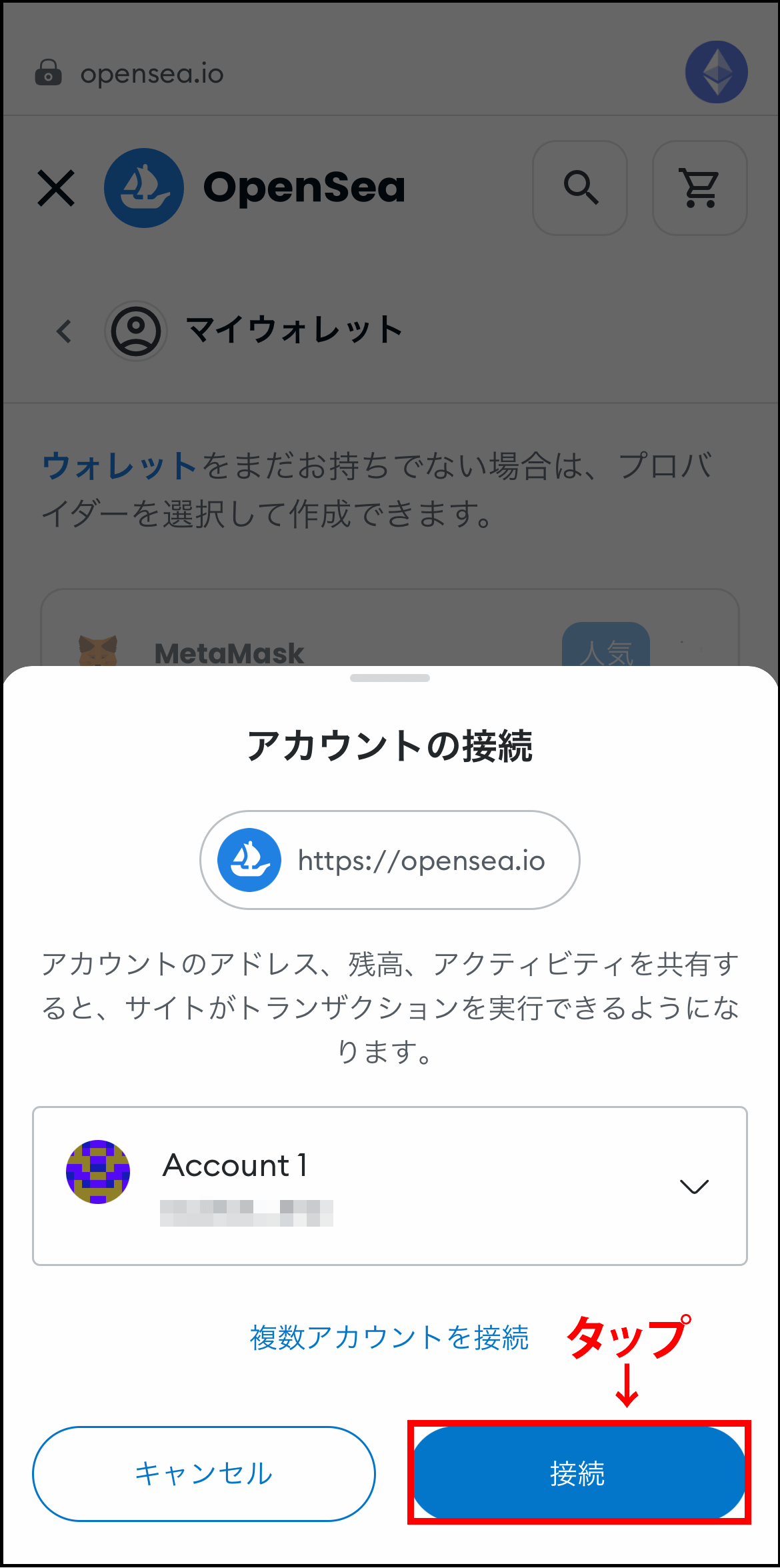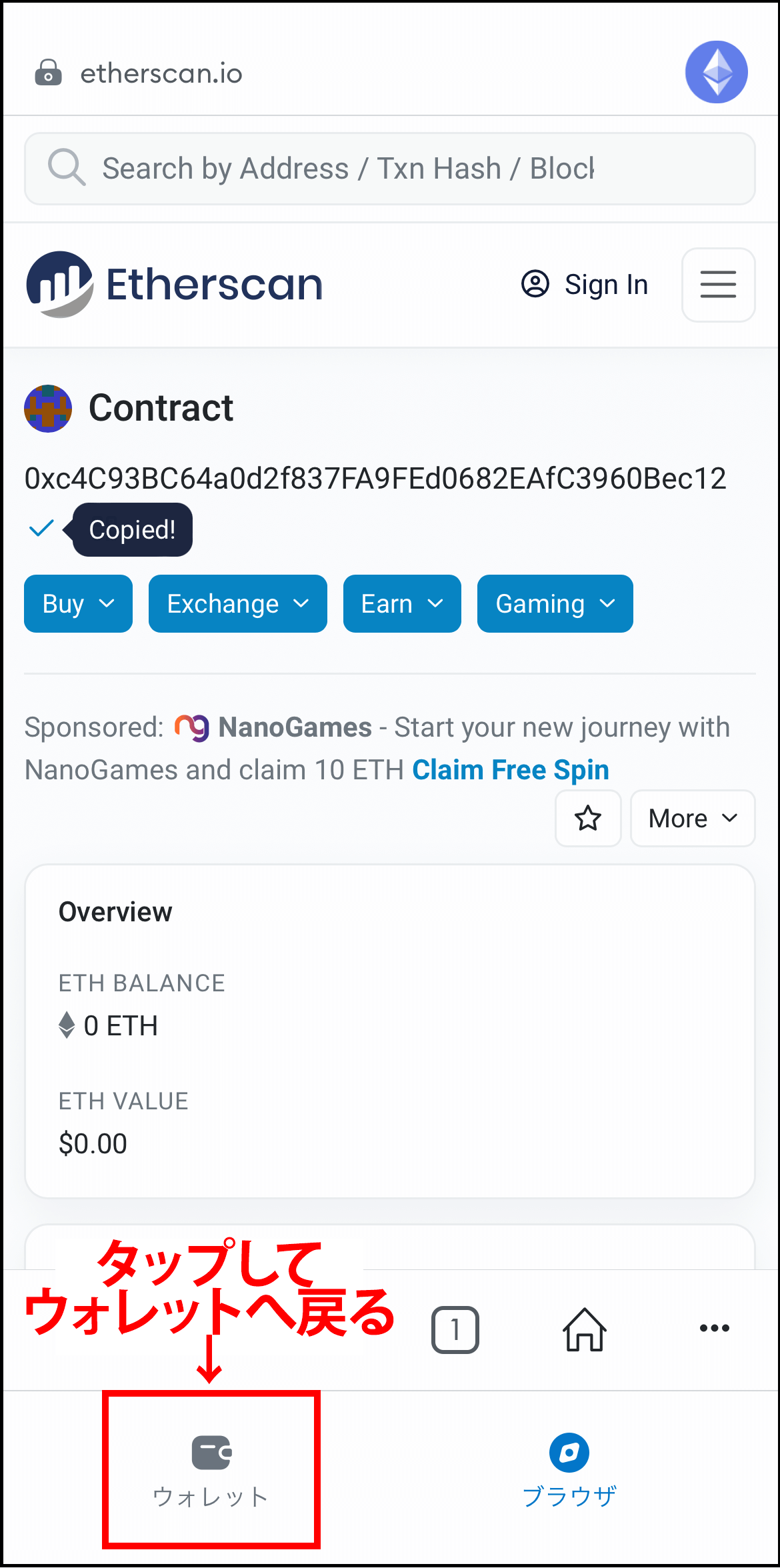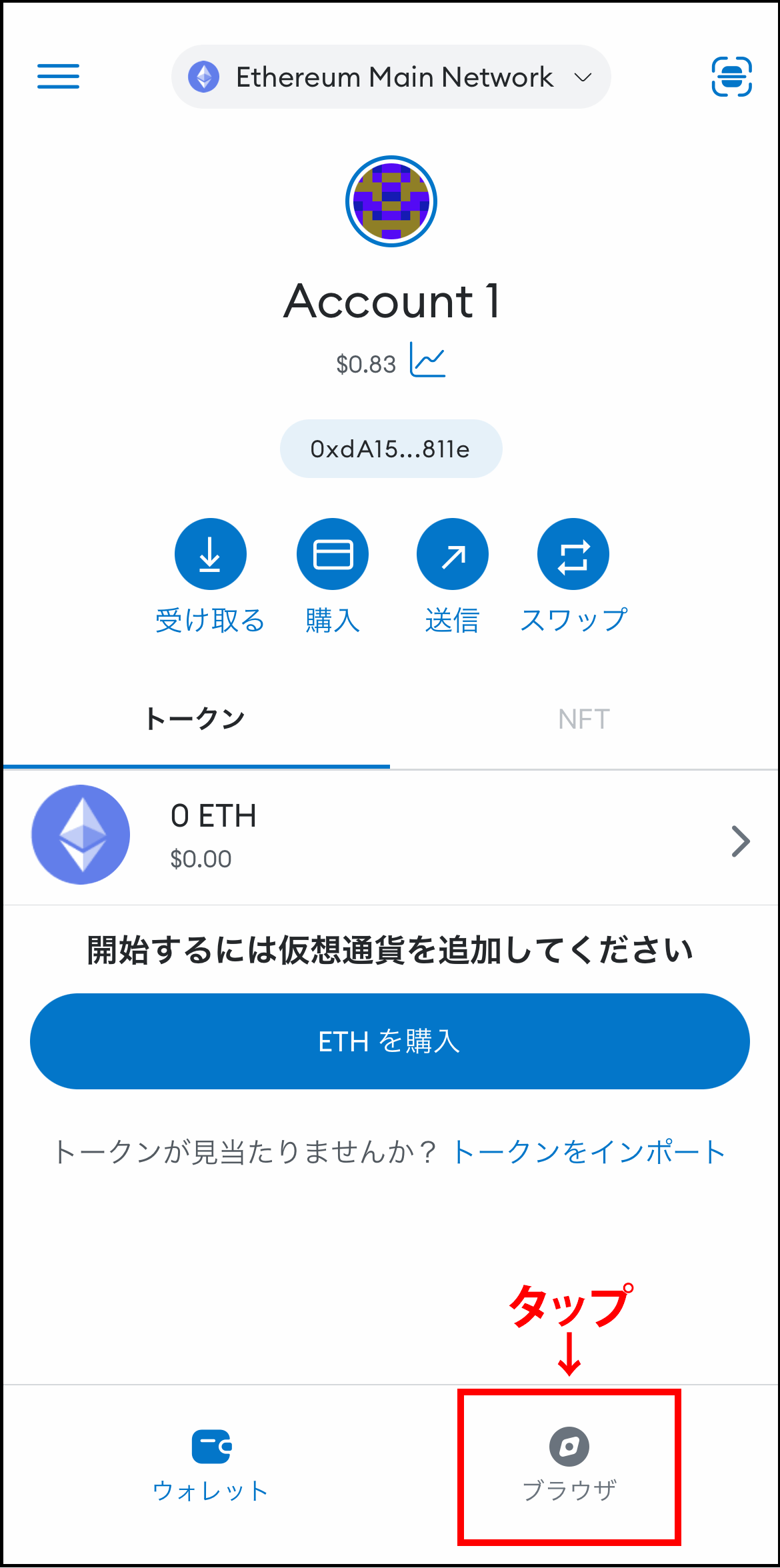 ①「ウォレット」をタップしてMetaMaskウォレットに戻ります(またはMetaMaskアプリを再度開く)