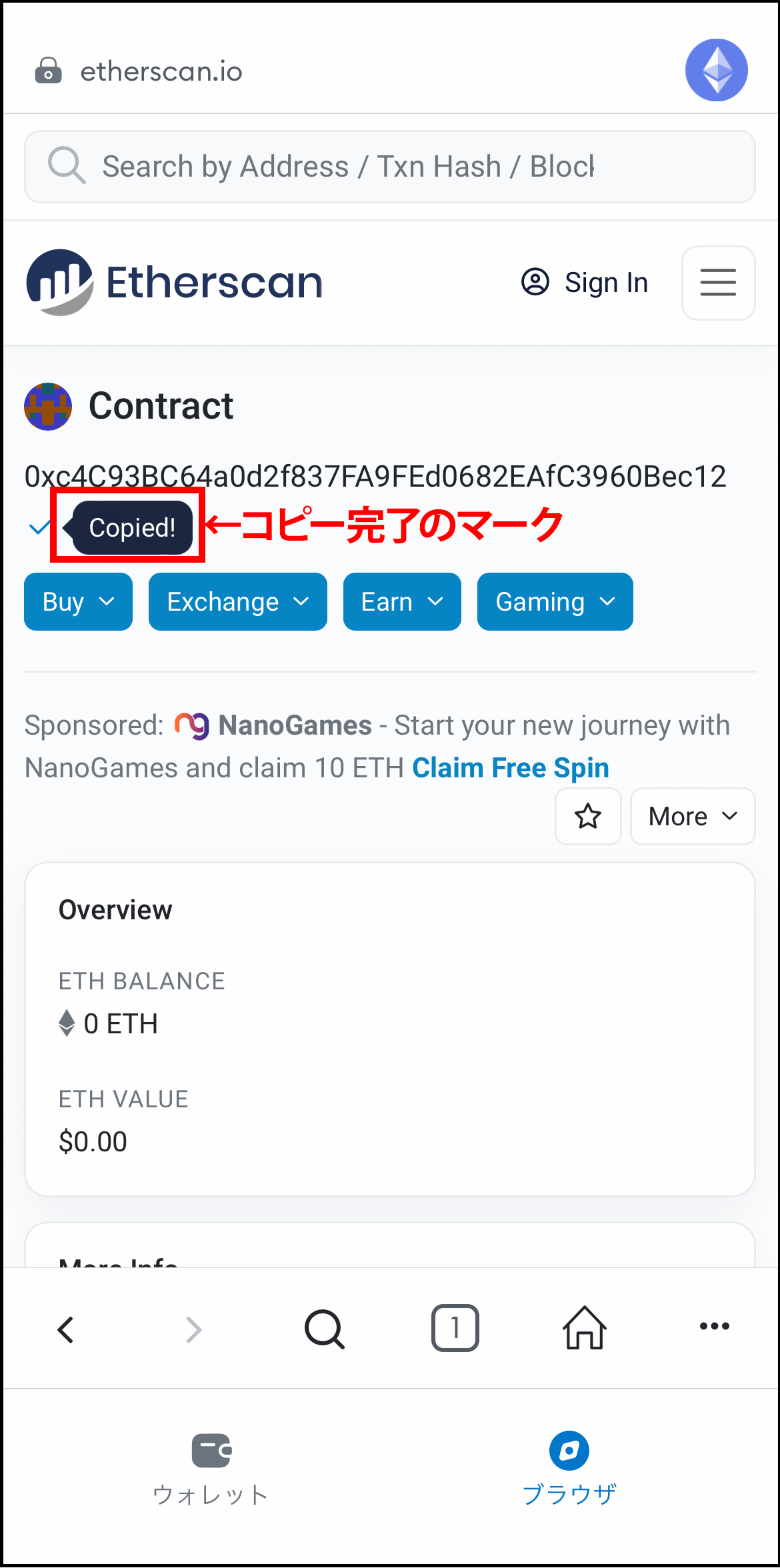 ⑤「Etherscan」で全文が表示された[A:コントラクトアドレス]をコピーします。
