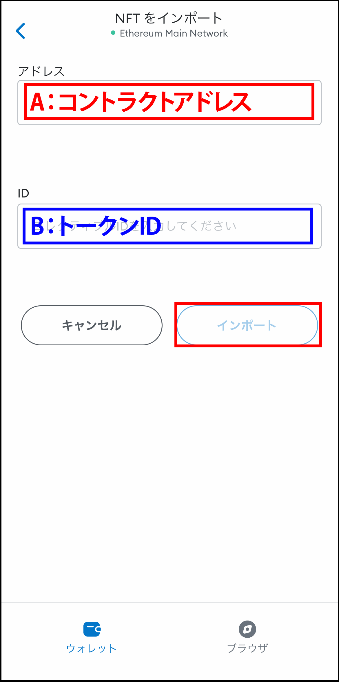 2:Metamaskウォレットに[A:コントラクトアドレス][B:トークンID]を入力