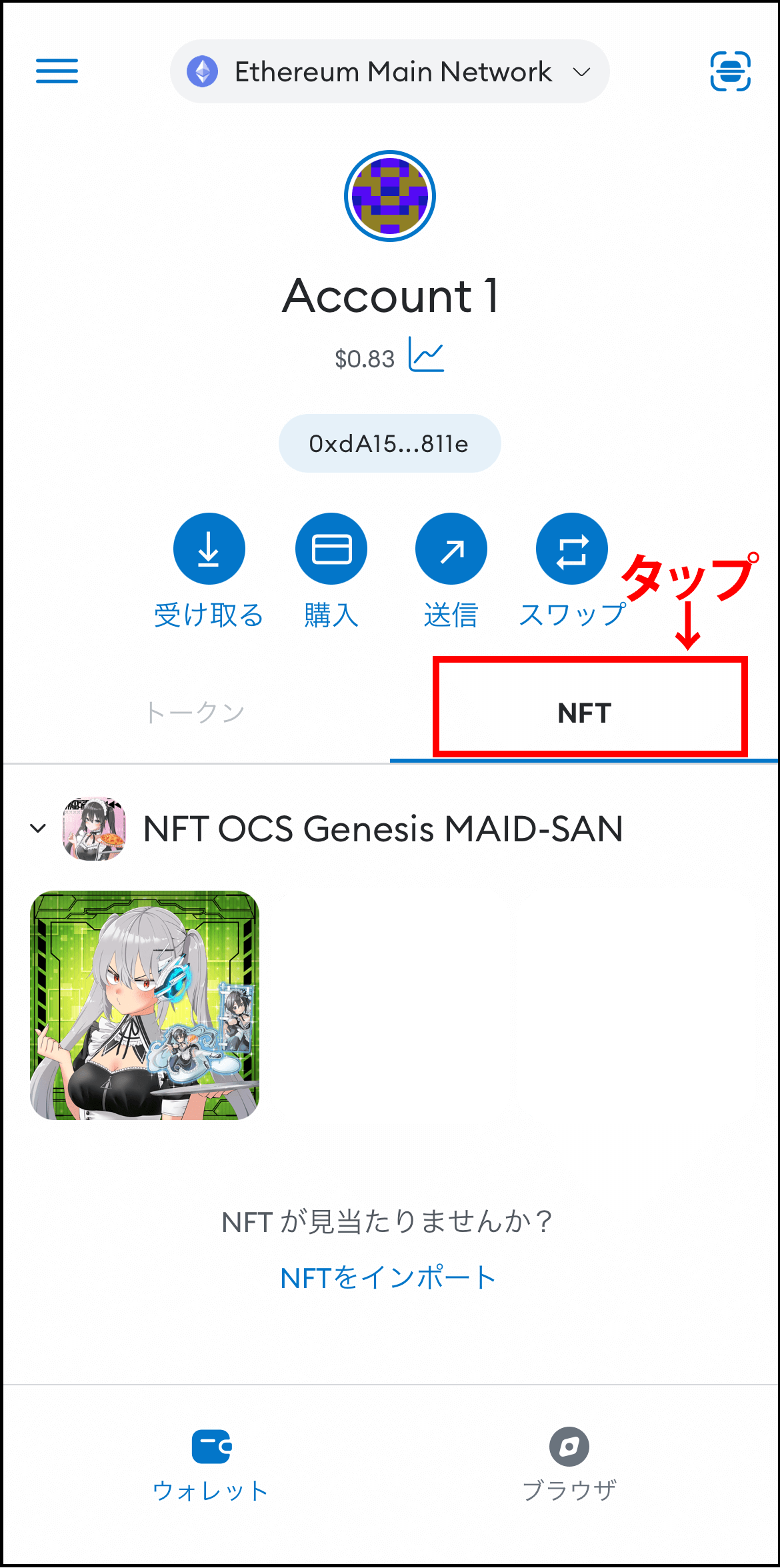 ①Metamaskアプリを起動し、「NFT」タブをタップして選択