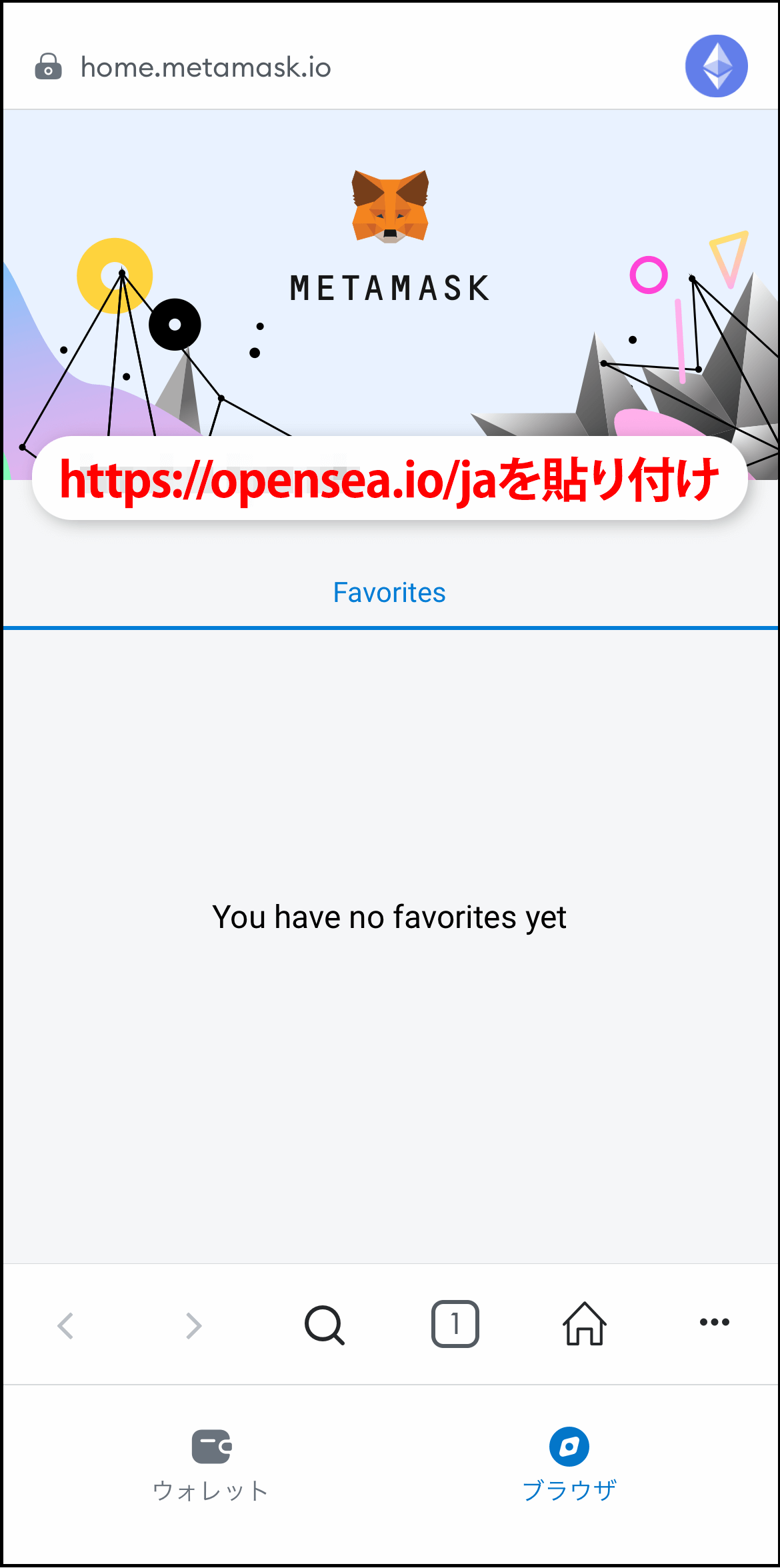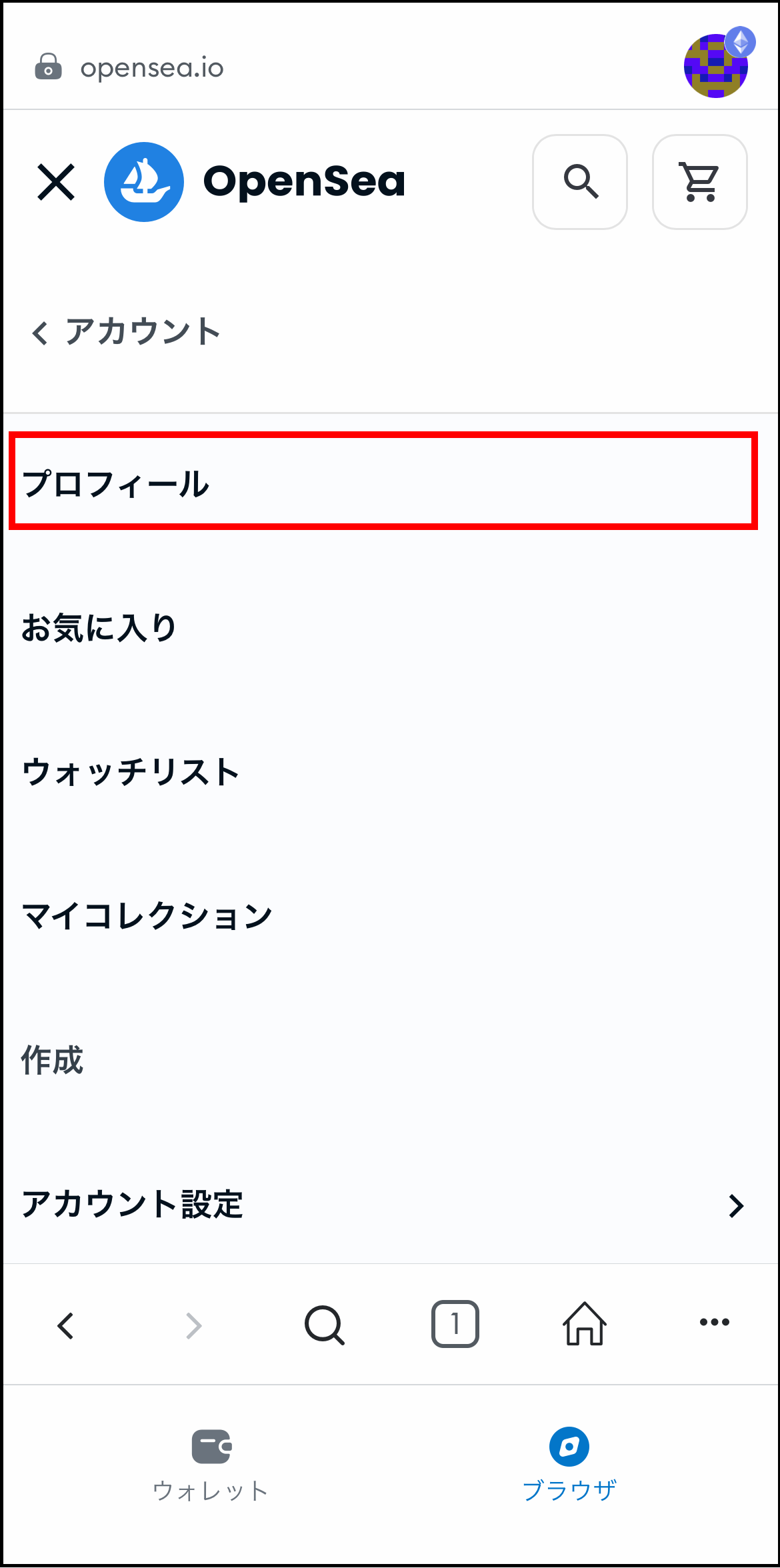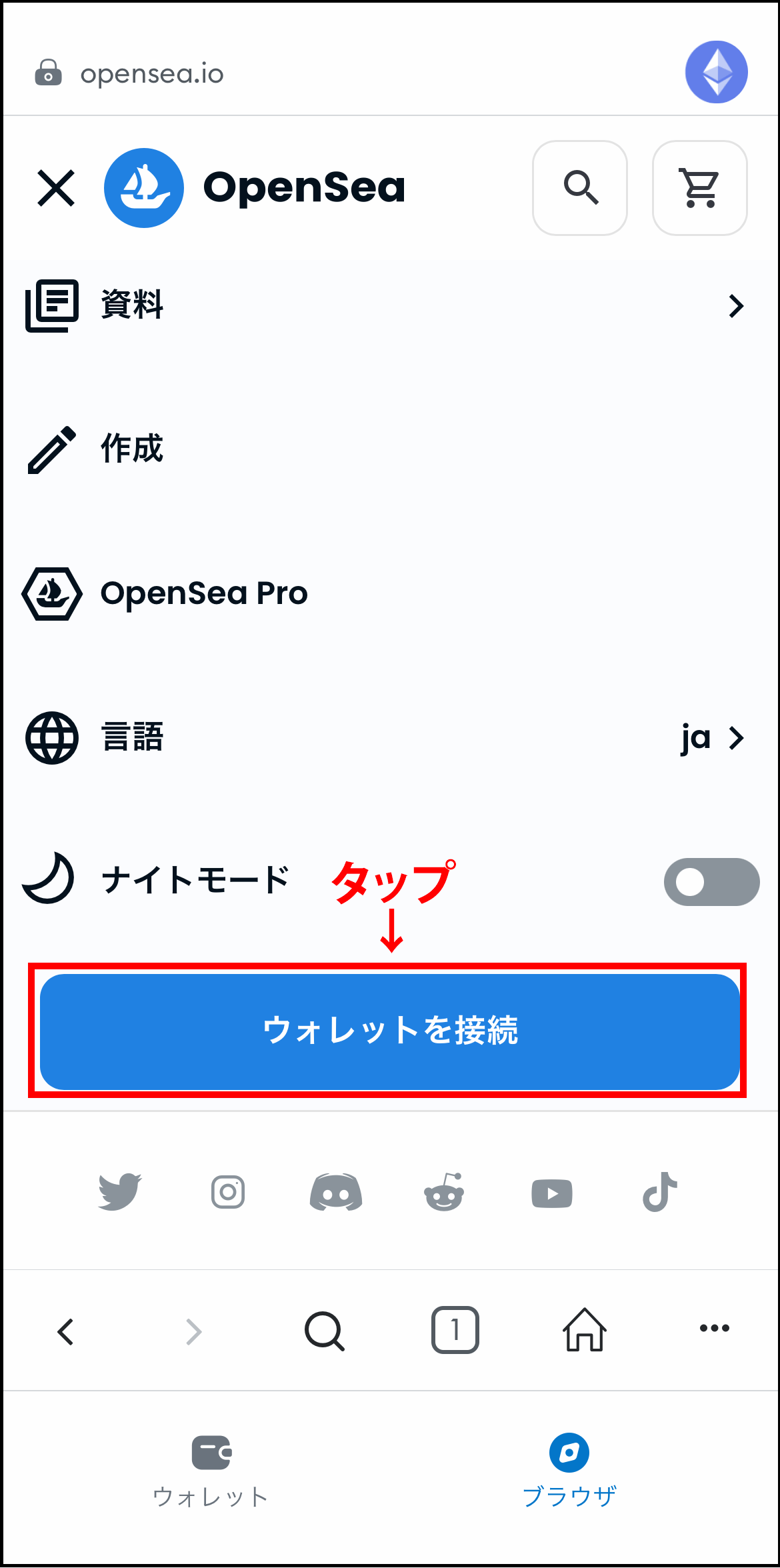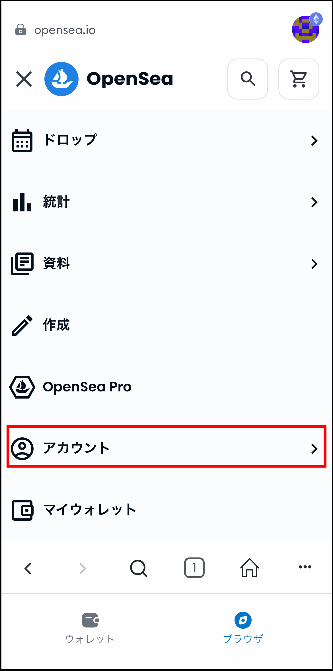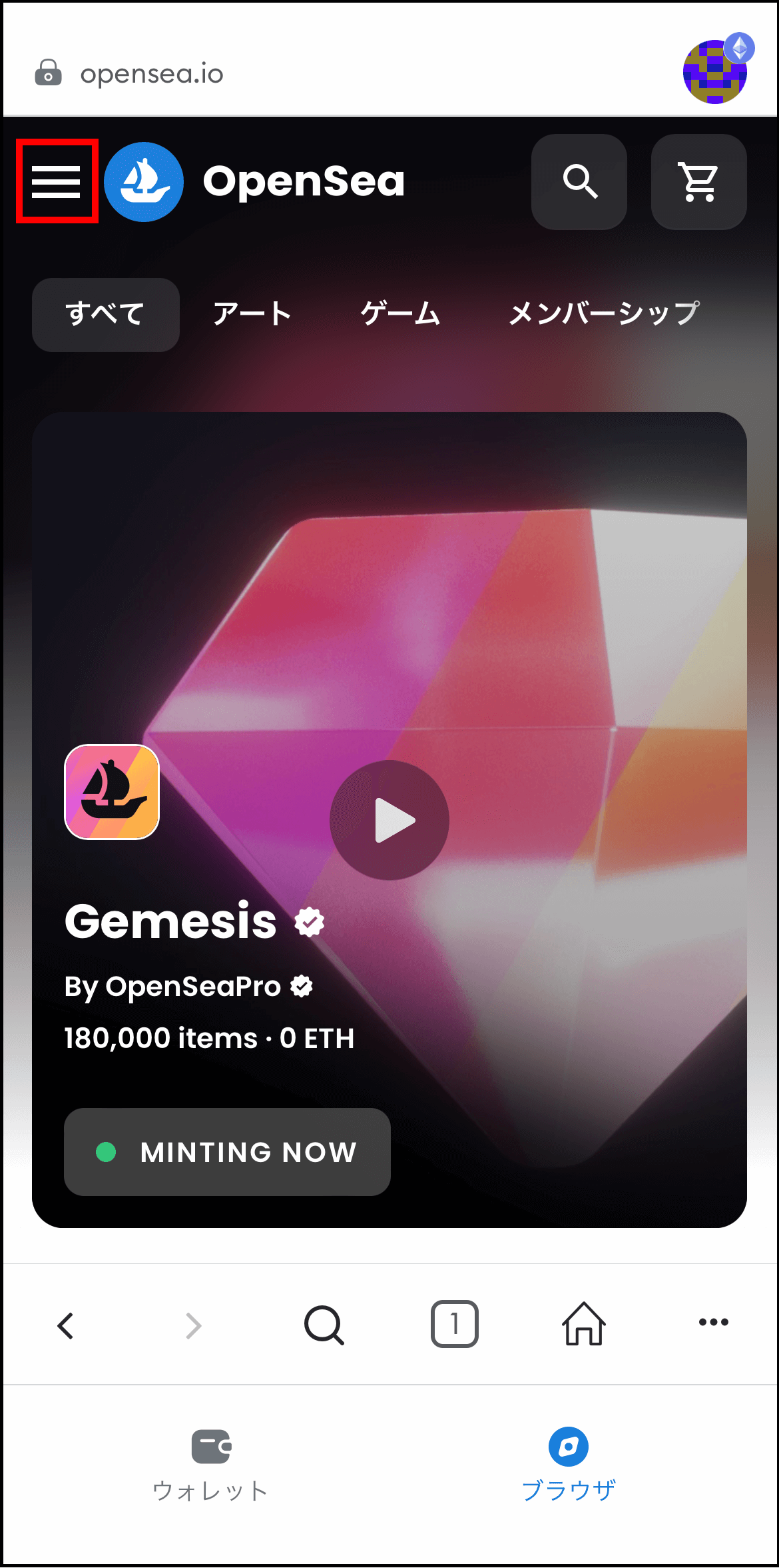 ①MetaMaskアプリの「ブラウザから」からOpensea(https://opensea.io/ja)へアクセス